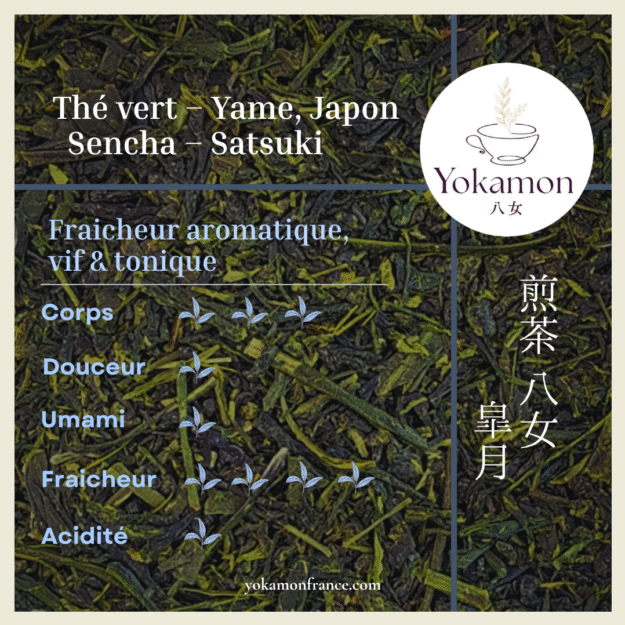 Le sencha Satsuki, cultivé sans pesticides, est un thé de la première récolte de l’année (Ichiban-cha), lors de la période de la « 88e nuit de printemps ».